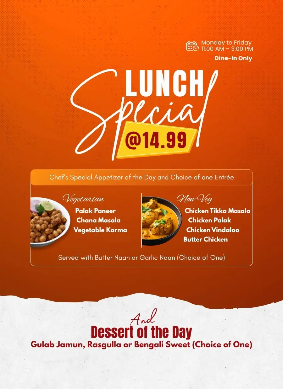 Our menu caters to all dietary preferences, including vegetarian, vegan, and gluten-free options. Guests can enjoy South Indian classics, Indo-Chinese treats, and hearty North Indian curries, making Tabla Indian Restaurant a favorite among families and food lovers.